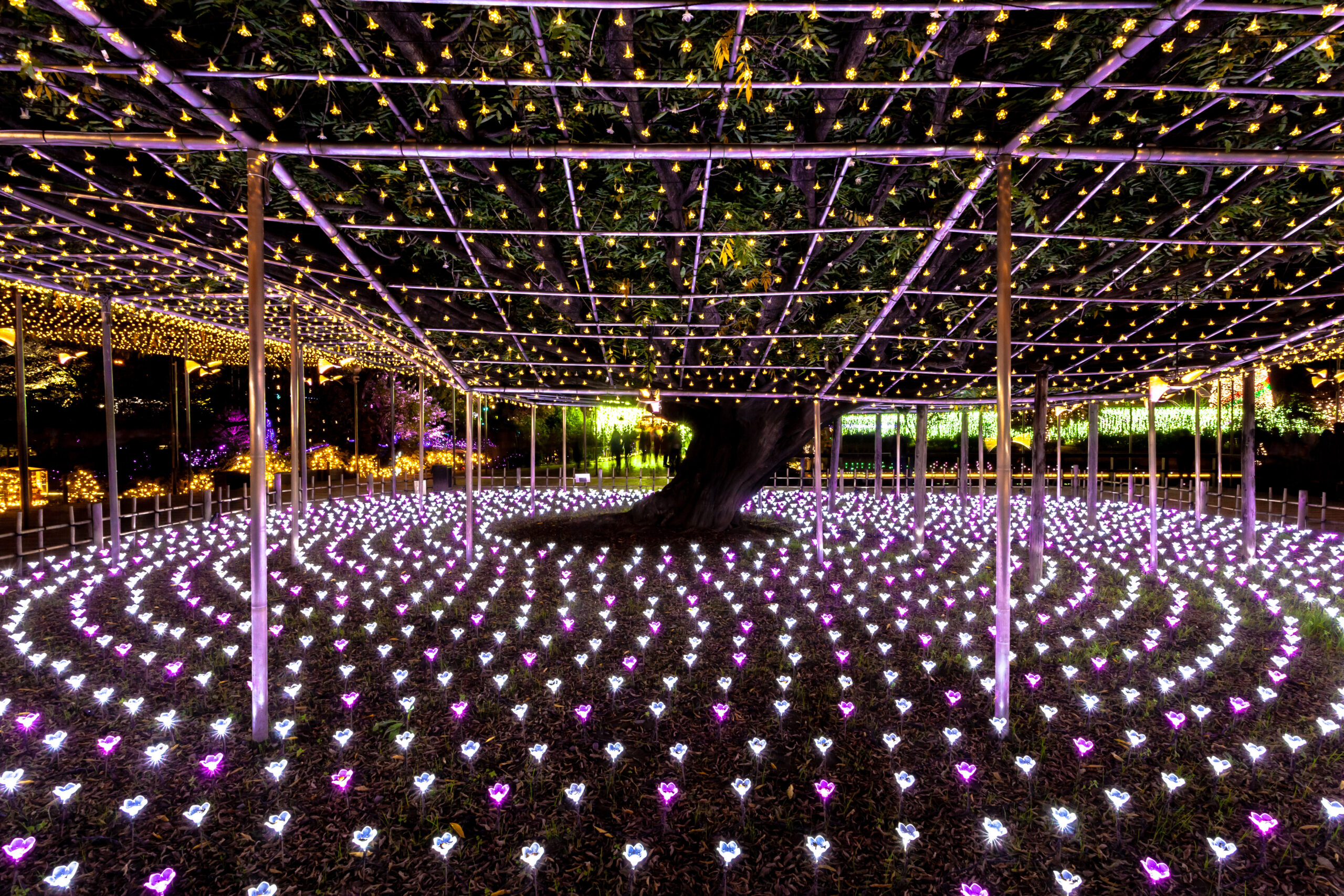 ต้นวิสทีเรียหลากสีสันทั้งสีม่วง, สีขาว, สีเหลือง และสีชมพู ถ้าต้นไหนอายุมากก็จะยิ่งแผ่กิ่งก้านออกไปได้ไกหลายสิบเมตรดูยิ่งใหญ่มาก นอกจากนี้ยังมีการจัดสวนในโซนต่างๆ ให้ได้เดินชมกัน เช่น พีรามิดดอกไม้กลางสระน้ำ, โดมดอกไม้บนสะพาน และสระน้ำมากมายที่สะท้อนสีสันของดอกไม้ดูสวยงามตระการตา