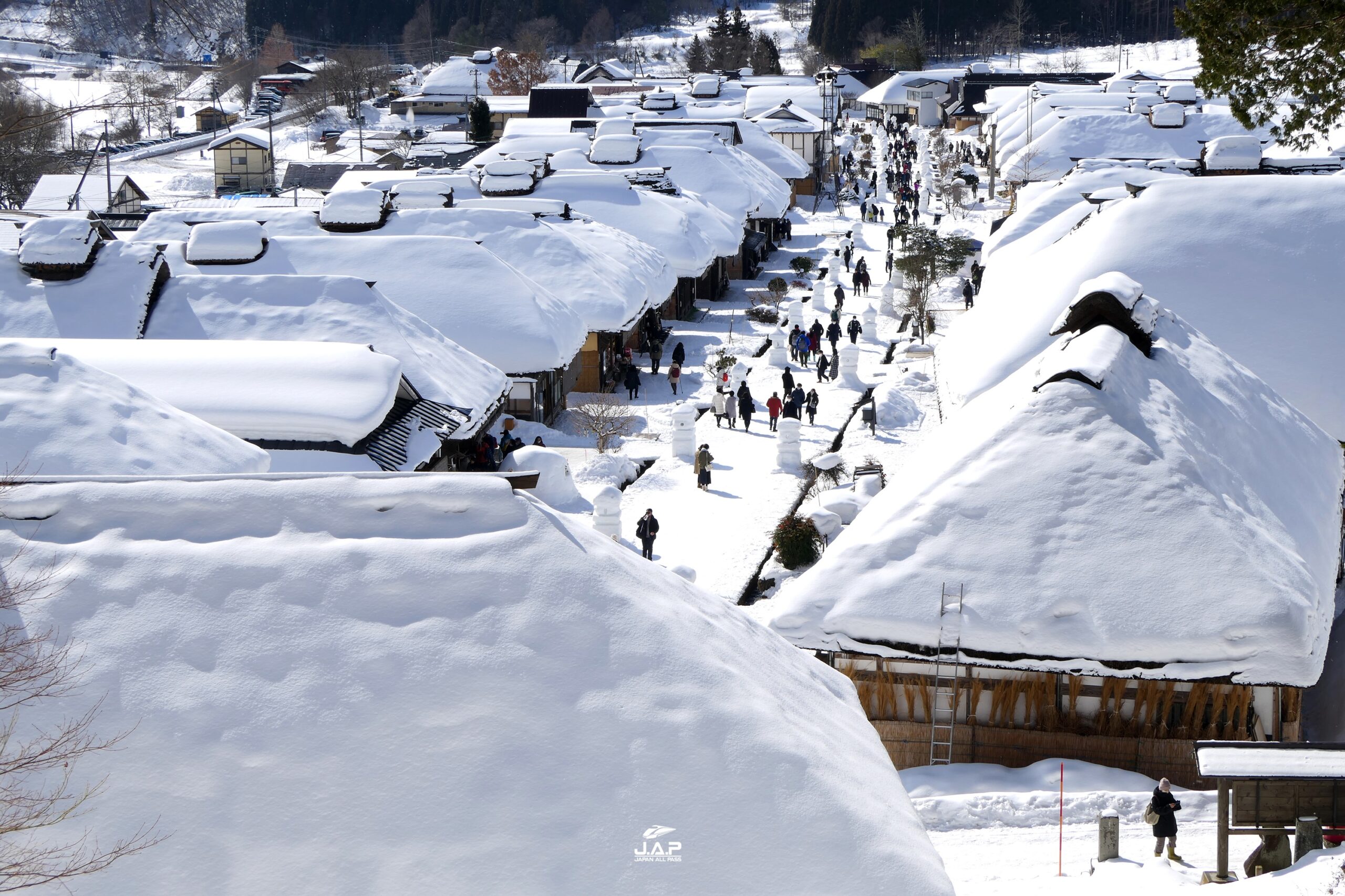 จากสถานี JR Aizu Wakamatsu นั่งรถไฟเอกชน Aizu Railway ไปลงสถานี Yunokami Onsen ก่อนนั่งซัตเติ้ลบัสเข้าไปยังหมู่บ้าน ….. เนื่องจากการเดินทางไม่สามารถใช้ JR Pass/JR East Pass ได้ ถ้ามาเที่ยวช่วงหิมะ(และช่วงใบไม้เปลี่ยนสี) แนะนำให้ซื้อ Ouchijuku Pass ราคา 2,200 เยน (ราคาเมื่อปี 2023 / พาสมีอายุ 2 วัน) พาสใบนี้ใช้นั่งรถไฟ ไป-กลับ Aizuwakamatsu – Yunokami Onsen – Tonohetsuri รวมนั่งรถ Shuttle บัส ไป-กลับ หมู่บ้าน Ouchijuku ได้ฟรี