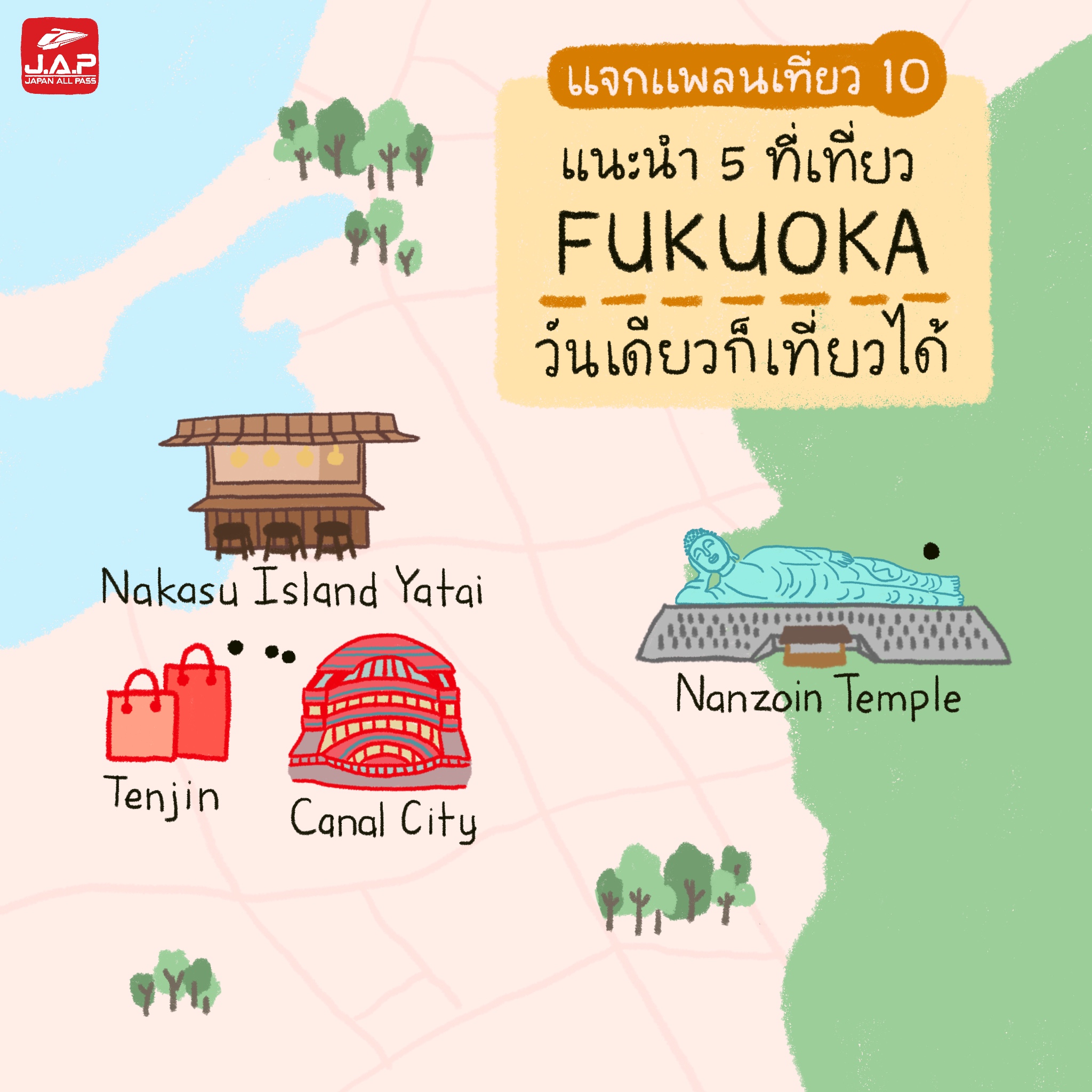 ฟุกุโอกะ เมืองท่าสำคัญของประเทศญี่ปุ่น เต็มไปด้วยประวัติศาสตร์และความทันสมัย สำหรับใครที่มีเวลาไม่มาก Japan all pass ขอแนะนำ 5 ที่เที่ยวฟุกุโอกะ แบบวันเดียวก็เที่ยวได้ โดยใช้บัตร JR kyushu North Rail Pass และ SUNQ Pass Northern Kyushu! จะมีที่ไหนบ้างตามไปดูกันเลย
