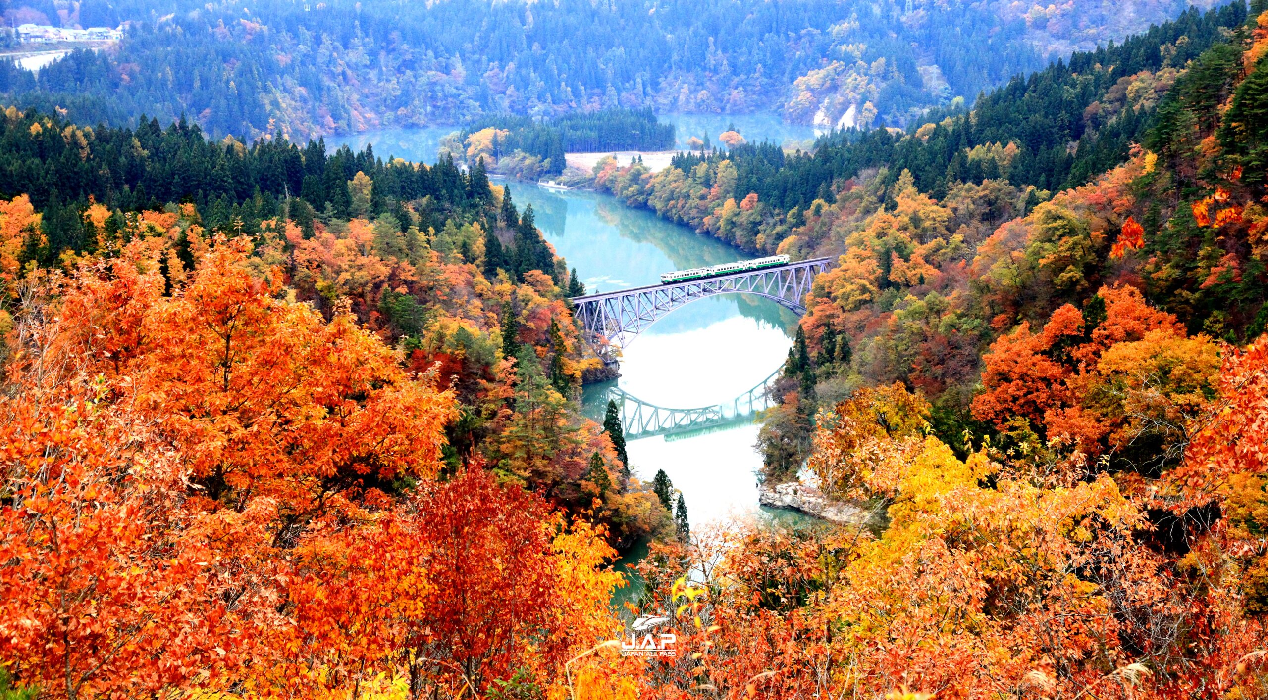 ภาพวิวที่หลายคนใฝ่ฝัน รถไฟวิ่งบนสะพานข้ามแม่น้ำ ทะดะมิ ท่ามกลางหุบเขาใบไม้เปลี่ยนสี