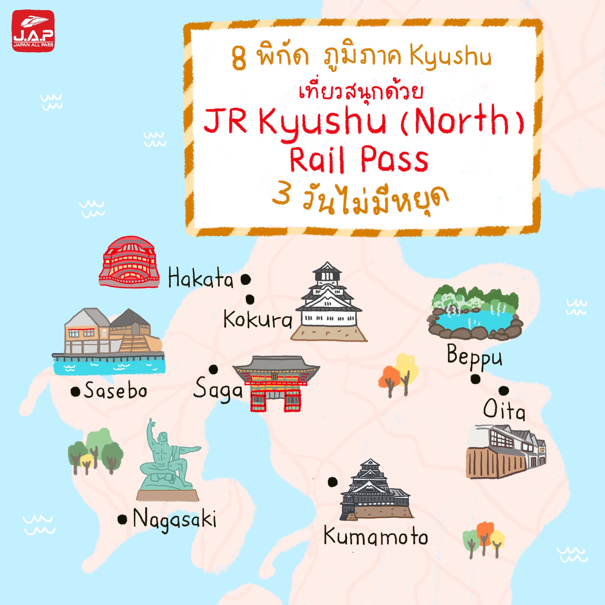 ภูมิภาคคิวชู ตั้งอยู่ทางตอนใต้ของญี่ปุ่น เป็นที่รู้จักในด้านธรรมชาติอันสวยงาม และสถานที่ทางประวัติศาสตร์ที่ยาวนาน วัฒนธรรมอันหลากหลาย รอให้ทุกคนมาพบเจอ Japan All Pass ขอแชร์แผนเที่ยวกับ 8 พิกัด ในภูมิภาคนี้ จะมีที่ไหนน่าสนใจบ้าง ห้ามพลาด ตามไปดูกันเลย