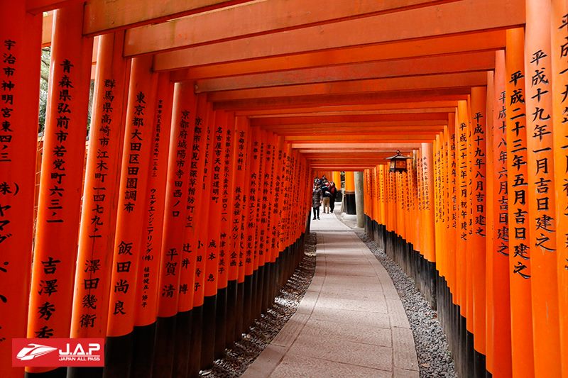 ใครเคยมาเที่ยวที่นี่แล้วบ้างคะ ศาลเจ้าฟุชิมิ อินาริ (Fushimi Inari Shrine) เกียวโต มาแล้วก็ต้องแวะถ่ายรูปกับโทริอิ (Torii) สีแดงเหล่านี้ เป็นประตูศาลเจ้าที่เรียงต่อกันยาวๆ จากตีนเขาไปถึงยอดเขาสูง ความยาวประมาณ 4 ก.ม. ซึ่งถือเป็นจุดเด่นของที่นี่ ตามความเชื่อของชาวญี่ปุ่นในอดีตว่าเปรียบเหมือนประตูทางเข้าสู่สวรรค์ สร้างขึ้นเพื่อสักการะเทพอินาริ ที่เป็นเทพเจ้าแห่งการเพาะปลูกและอุตสาหกรรม ภายในศาลเจ้าเราจะพบรูปปั้นหรือสัญลักษณ์สุนัขจิ้งจอกมากมาย เพราะเชื่อกันว่าคือผู้นำสารขององค์เทพเจ้าอินาริค่ะ