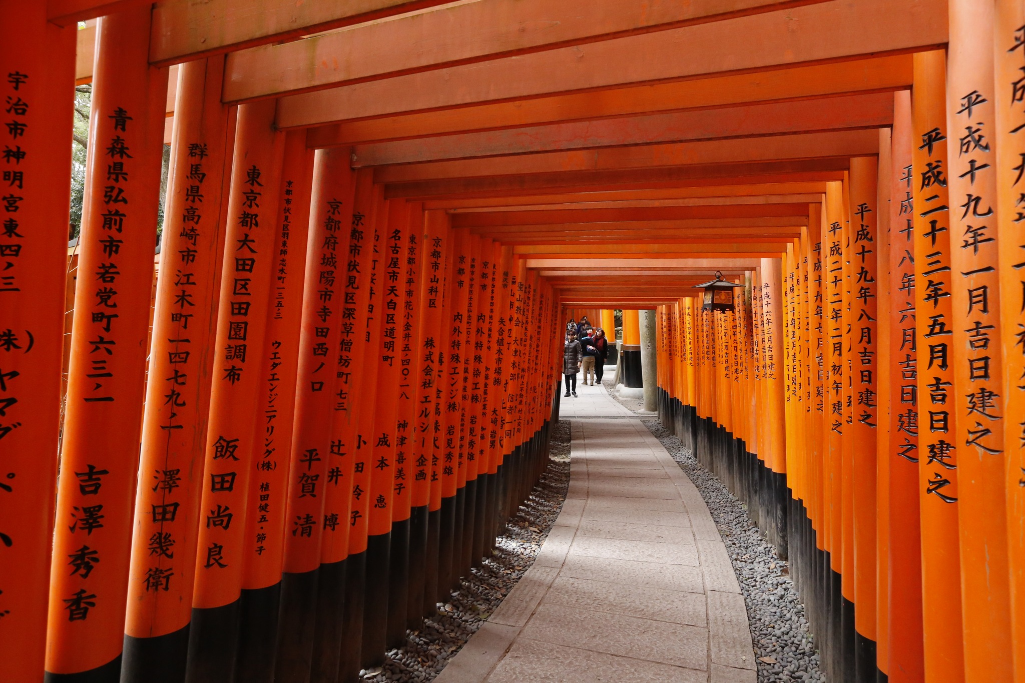 เป็นจุดเช็คอินแรกที่ JAP อยากแนะนำ คือ ศาลเจ้าฟุชิมิอินาริ ที่มีเสาโทริอิสีแดงนับพันต้นที่เรียงรายติดๆกันไปตามทางเดินขึ้นสู่ยอดเขาอินาริท่ามกลางธรรมชาติอันเงียบสงบ ซึ่งถือเป็นจุดไฮไลท์เด่นที่จะต้องไปเดินรอดผ่านอุโมงเสาโทริอิที่ยาวกว่า4 กิโลเมตร โดยด้านบนของยอดเขานี้จะเป็นศาลของเทพเจ้าอินาริ ซึ่งเป็นตัวแทนของความอุดมสมบูรณ์ของพืชผล และมีสัตว์คู่กายเป็นสุนัขจิ้งจอก จึงไม่แปลกที่จะพบรูปปั้นสุนัขจิ้งจอกจำนวนมาก