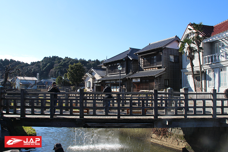 จากนั้นก็เดินทางไปตามป้ายเพื่อไปที่ ย่านประวัติศาสตร์ (Kurashiki Bikan Historical Quarter) ใช้เวลาเดินประมาณ 10-15 นาที ก็จะเจอกับอาคารบ้านเรือนโบราณ ที่เป็นที่พัก ร้านค้าที่ขายของที่ระลึกและร้านอาหารเต็มสองงข้างทาง