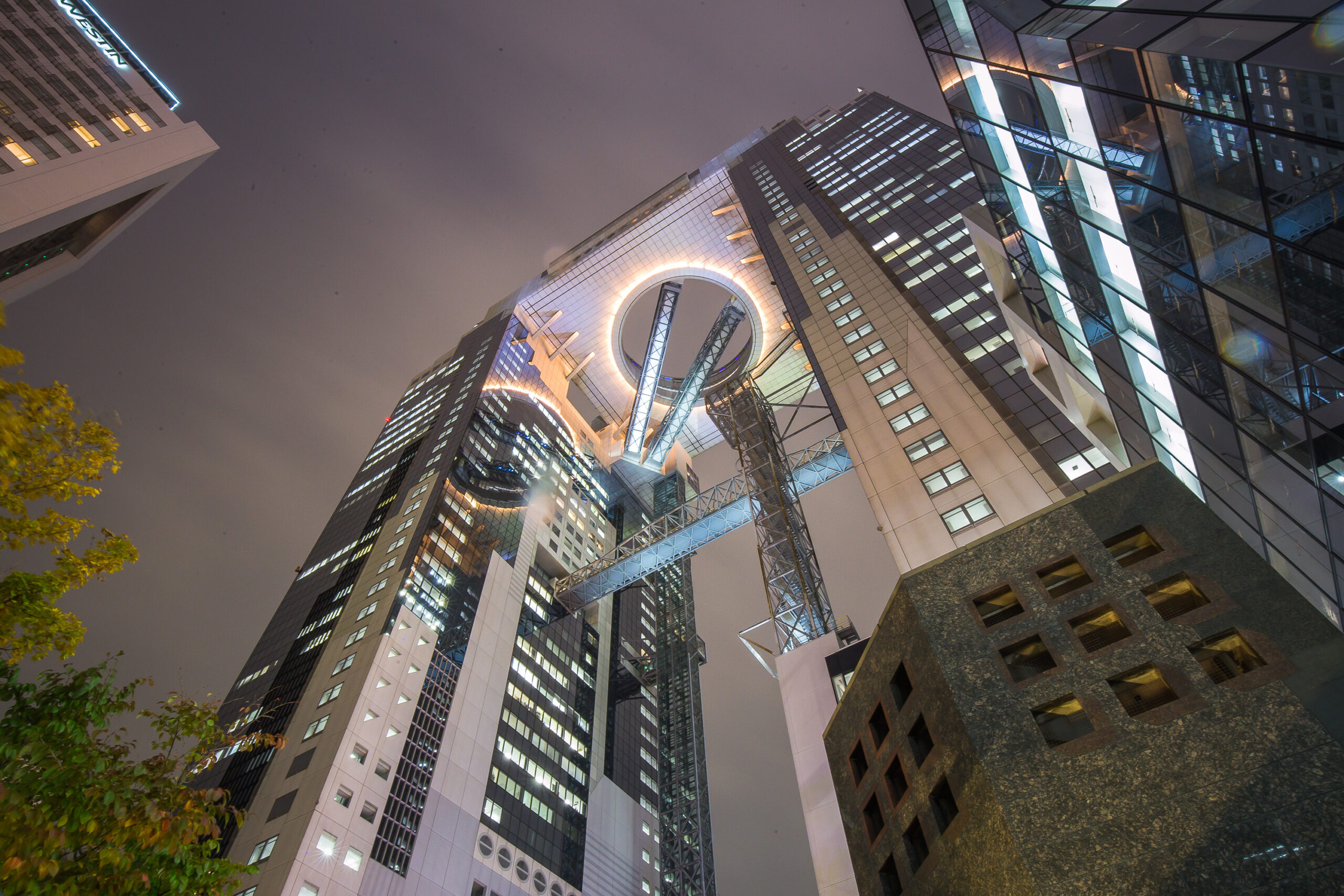 Umeda Sky Building เป็นตึกสูง 40 ชั้น ความสูงถึง 173 เมตร ในย่านอุเมดะ และเป็นอีกแลนด์มาร์กสำคัญของโอซาก้า ด้านบนอาคารมีทางเชื่อม เป็นสวนลอยฟ้าซึ่งมีชื่อ Kuchu Teien Observatory สามารถรับชมวิวเมืองโอซาก้าได้แบบจุใจเลย นอกจากจะเป็นจุดชมวิวแล้วยังมีร้านค้า โรงภาพยนต์ เป็นแหล่งท่องเที่ยวอีกจุดหนึ่งด้วย ที่มาโอซาก้าแล้วจะพลาดไม่ได้