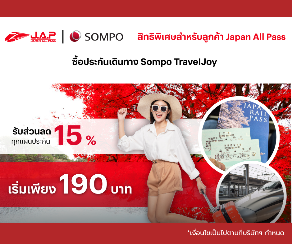 ● สิทธิพิเศษสำหรับลูกค้า Japan All Pass ซื้อประกันเดินทาง Sompo TravelJoy รับส่วนลดทุกแผนประกันทันที 15% เริ่มต้นเพียง 190 บาท